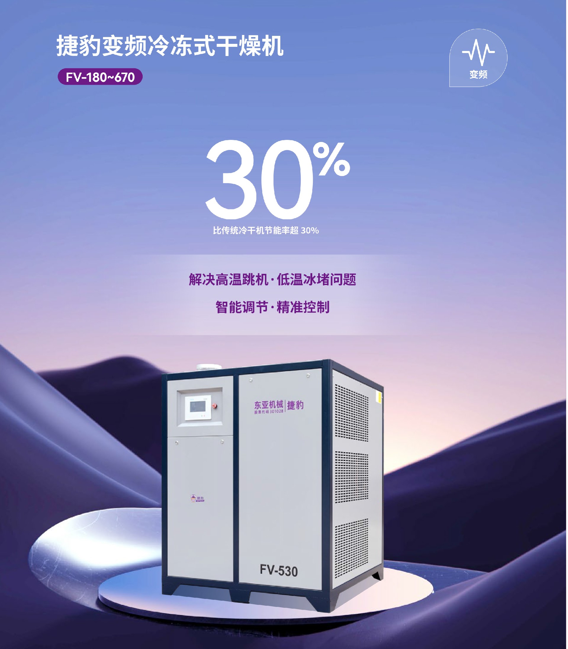 | 节能省电 | 捷豹自主研发 VSD 柔性直流变频技术,可根据不同负载实时调整冷干机运行 频率,最低运行功率仅仅只有工频冷干机的 20% 左右。 |